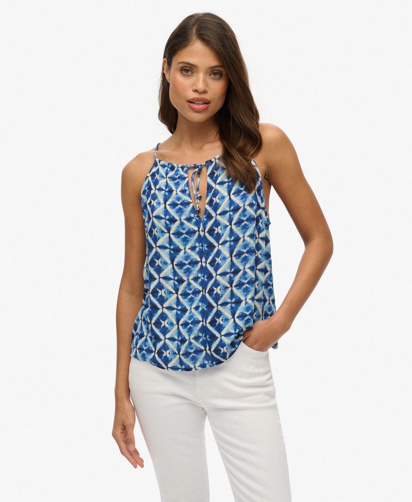 Top con estampado geométrico tricolor. De color blanco, azul celeste y azul marino. De tirante fino y cuello redondo con goma. Con detalle calado en la parte inferior. De patronaje amplío y cómodo. De tejido vaporoso, ligero y fresco. Tejido de buena calidad y fácil lavado. Combínalo con unos shorts vaqueros de aspecto desgastado y un capazo de mimbre y obtendrás un look radiante y espectacular. Además es una prenda perfecta para añadir color y vitalidad a tu fondo de armario. Y con una gran relación calidad - precio. Acertarás con la compra. Estilo casualwear.