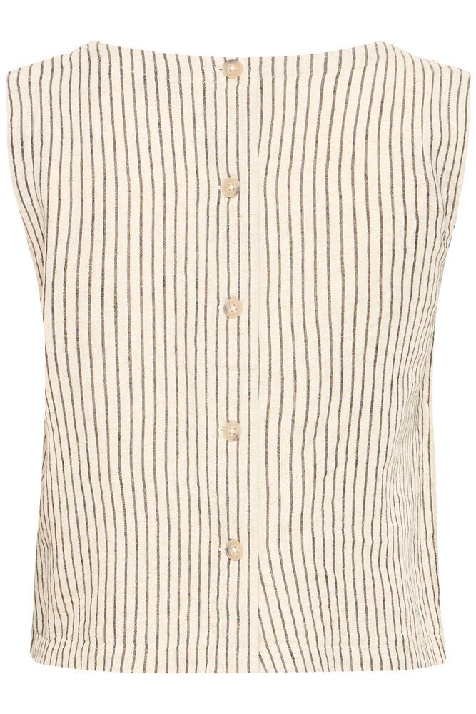 Top s/m abotonado. De color beige y rayas en negro. Con botonadura de color marrón claro. Con cuello redondo. Diseño de inspiración en los clásicos de la haute couture. Tejido fino, ligero y muy fresco. Tejido de buena calidad y fácil lavado. Fabricado con concepción ecológica y responsabilidad medio ambiental. Una prenda, eminentemente básica, que siempre podrás combinar con una gran variedad de propuestas. Además siempre te aportará un toque elegante y minimalista a tus looks. Y no tiene fecha de caducidad, lo que lo convierte en una magnífica inversión para tu bolsillo y para tu ropero. Acierto seguro! Estilo casualwear.
